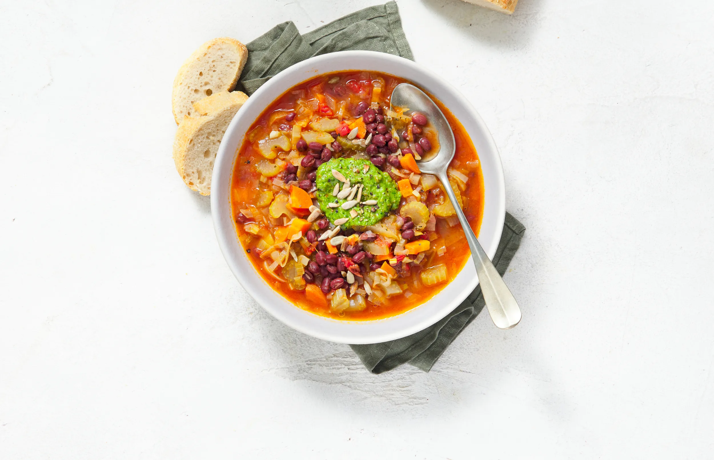 Serveer de soep met de pesto en het brood. De pesto is bedoeld voor in de soep, maar natuurlijk ook heel lekker op het brood!