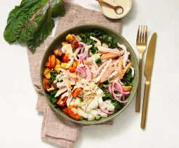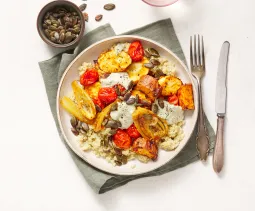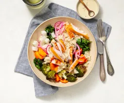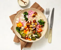 Maak een bowl met rijst, ovengroenten, koolrabi, snijbiet, ingelegde rode ui en tofu. Serveer met de mayo-sojasaus.
