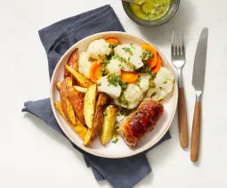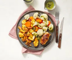 Schil 200 g zoete aardappel en snij in blokjes. Schil en halveer 125 g wortel in de lengte en snij in halve maantjes van ca. 1 cm. Doe in een mengkom met olie, ¾ tl paprikapoeder, peper en zout. Spreid uit over een met bakpapier beklede bakplaat en bak ca. 20 minuten in de oven.