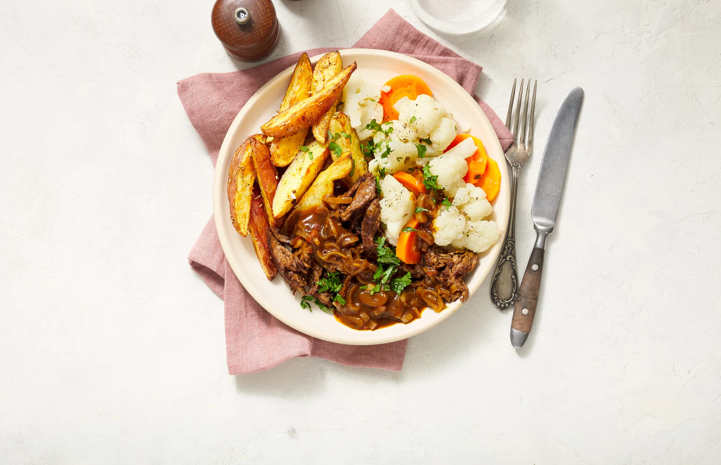 Serveer het PLNT stoofvlees met de wedges, groenten en jus. Garneer met 1 bosje peterselie.
