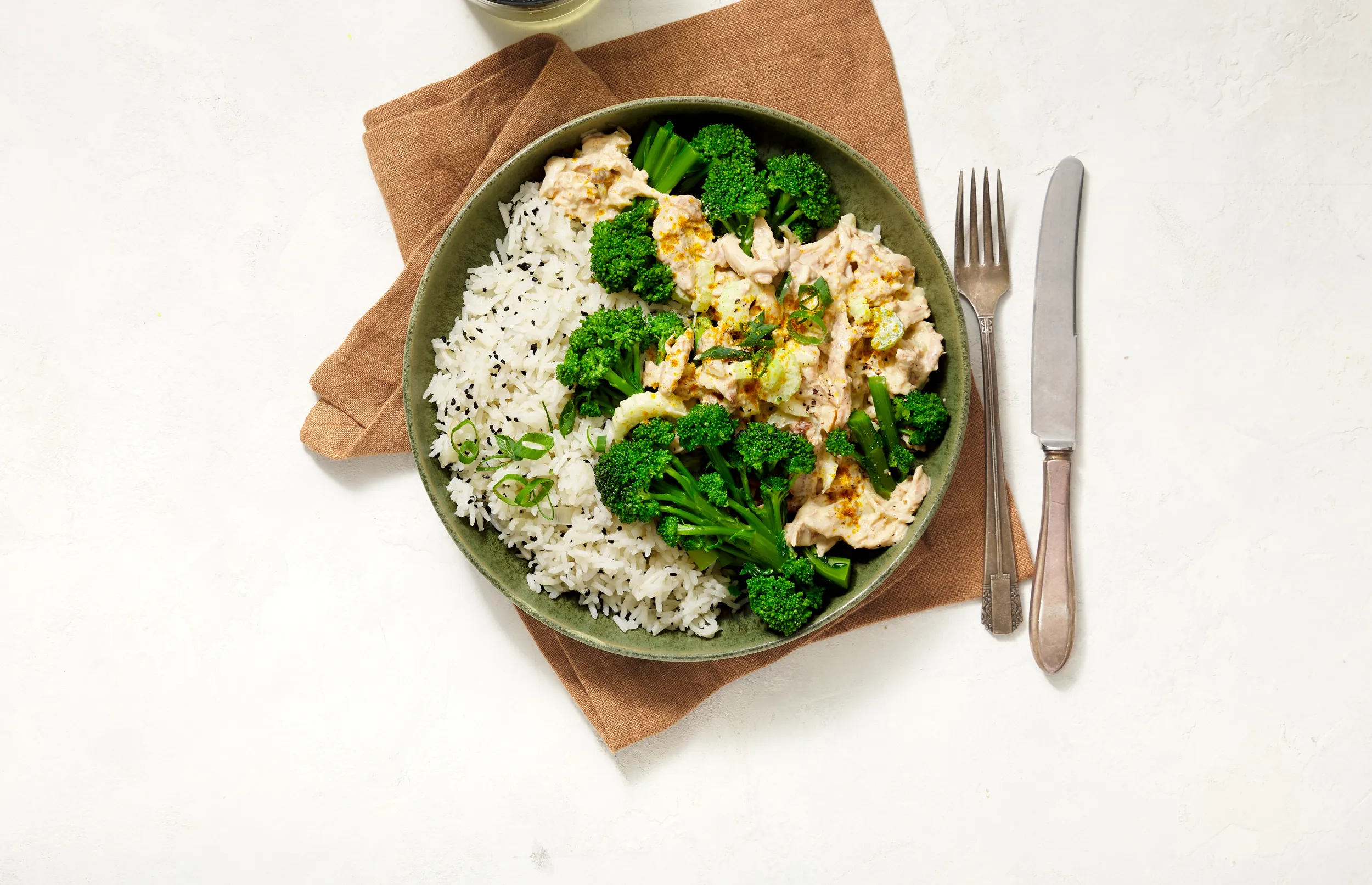 Coronation chicken met basmati-nigellarijst, lente-ui en sprouting broccoli