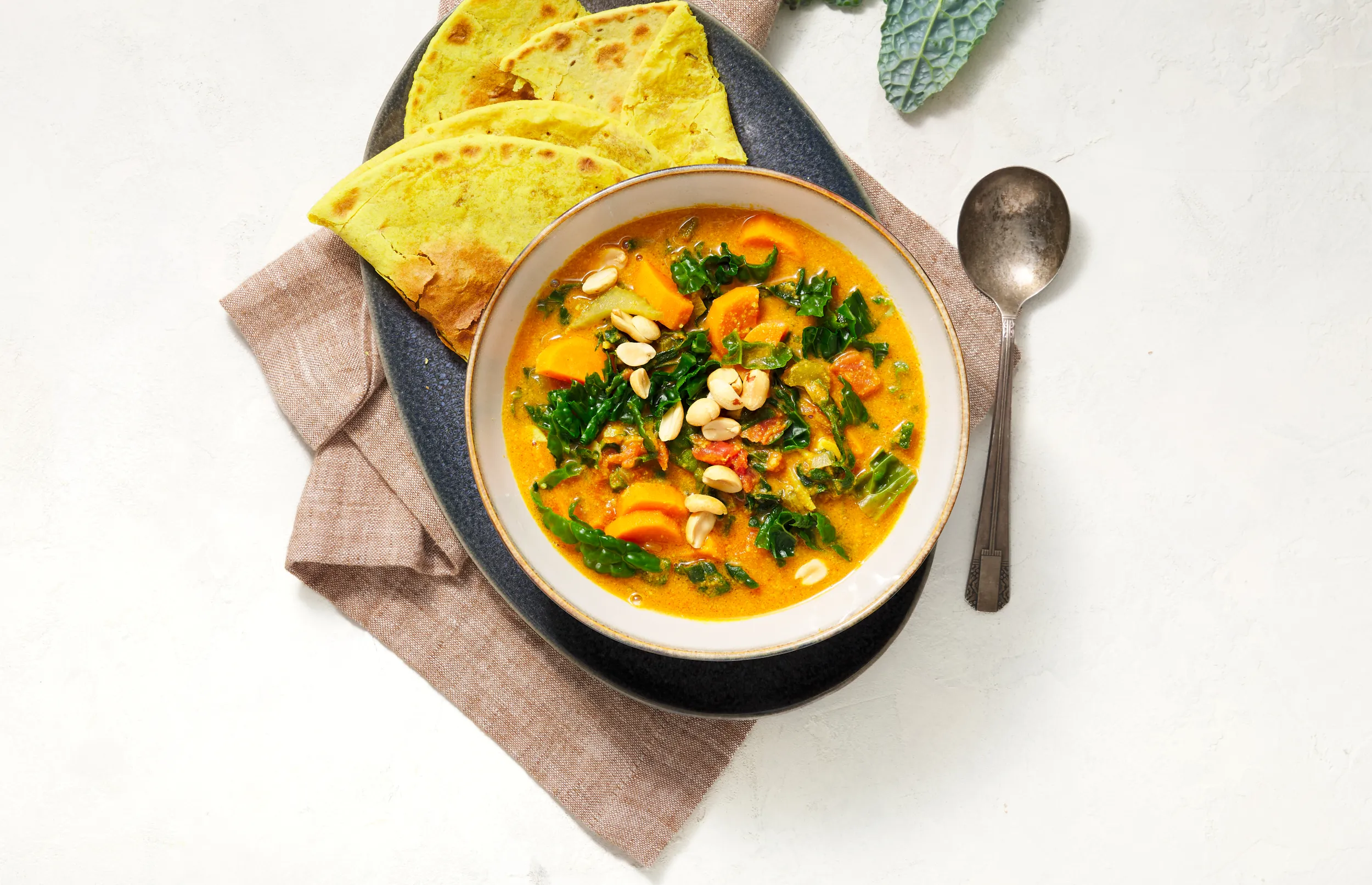 Breng de soep op smaak met zout en peper. Serveer in een diep bord met de roti om te dippen en garneer met de losse pinda’s.
