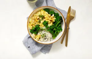 Giet de broccoli af, doe terug in de pan en knijp er een klein teentje knoflook bij. Schud goed om en breng op smaak met een scheutje olijfolie extra vierge, een kneepje citroensap (mag uit een flesje) en peper en zout.