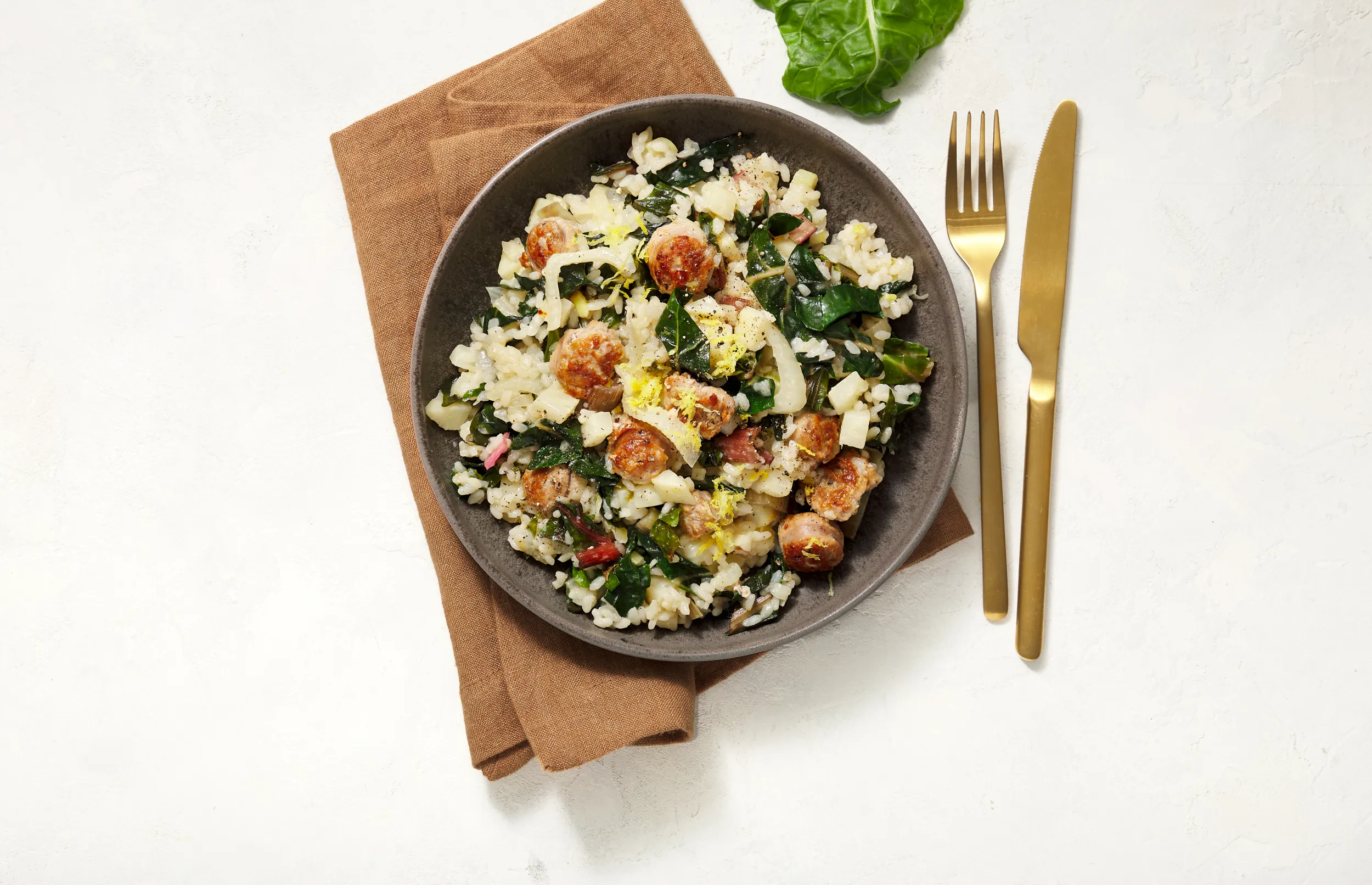Roer - als de rijst gaar is – het snijbietblad, de worst (incl. bakvet!), de citroenrasp en de kaas door de risotto en warm nog één minuut mee tot het snijbietblad is geslonken.