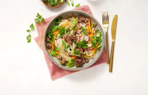 Voeg het gehaktmengsel bij de noedels, samen met de radijs (inclusief azijn). Garneer met de lente-ui-ringetjes.