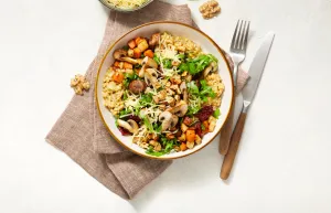 Schep 35 g rucola door de parelgort. Serveer met de groenten en garneer met de walnoten en de rest van de kaas.