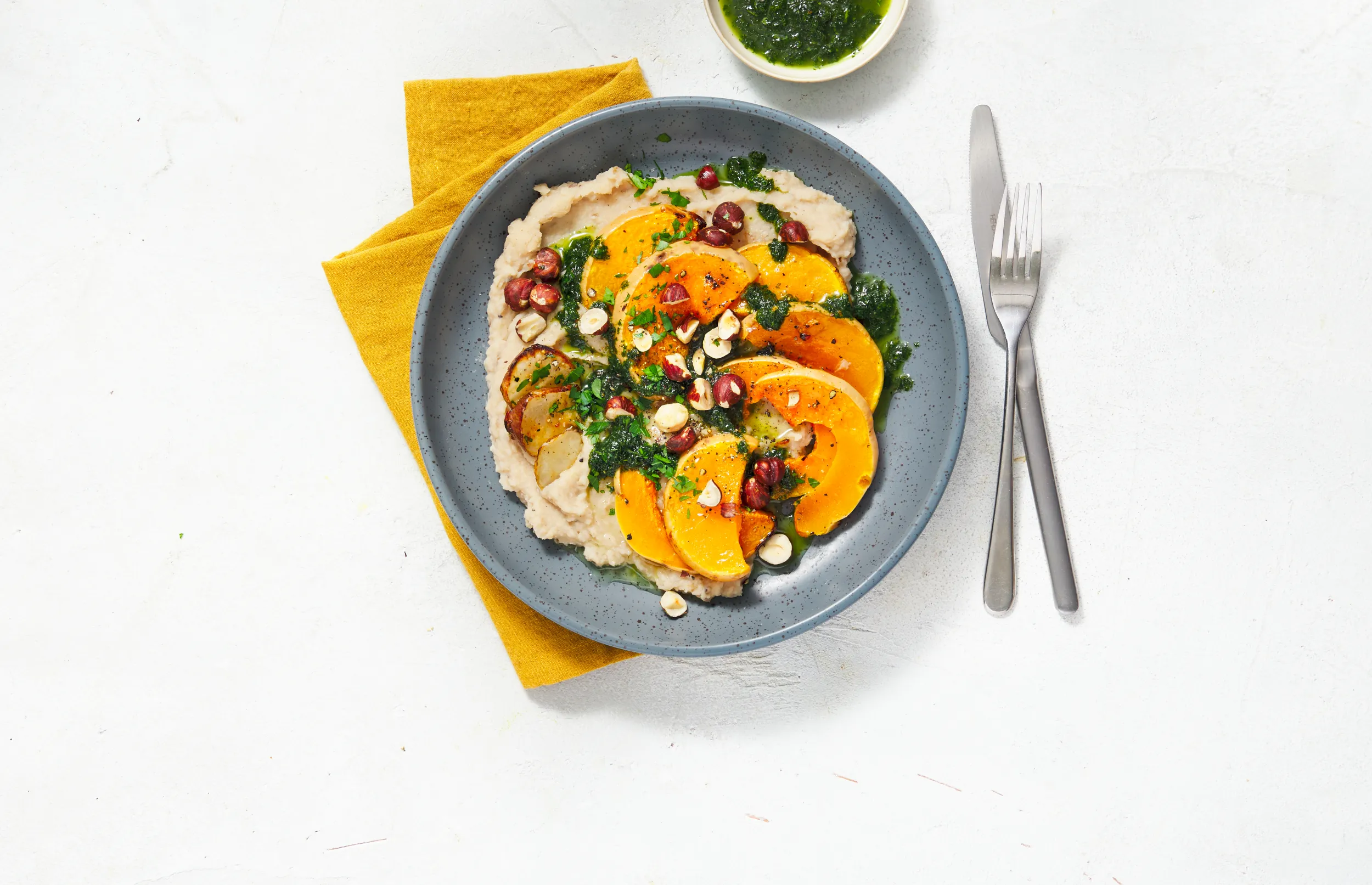 Serveer de bonen-aardpeerpuree met de pompoen, besprenkel royaal met de pestodressing en bestrooi met de hazelnoten.