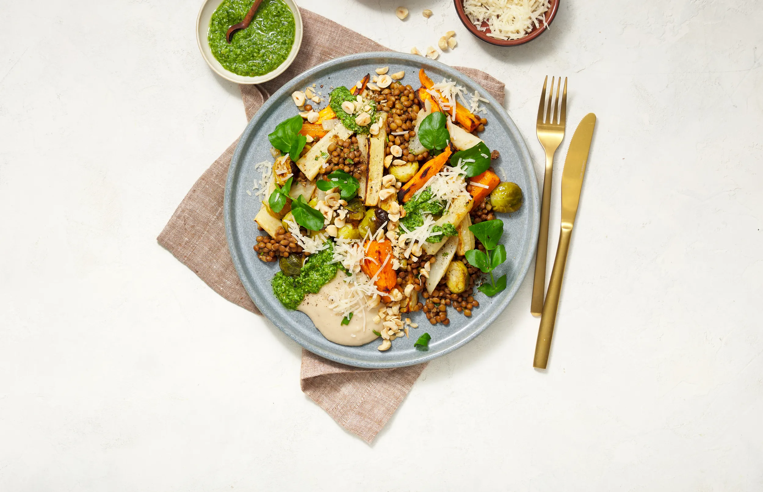 Schep de geroosterde groenten door de linzen. Garneer met 25 g waterkers en de hazelnoten. Serveer met de pesto, geraspte kaas en de ½ bakje wittebonen-hummus.