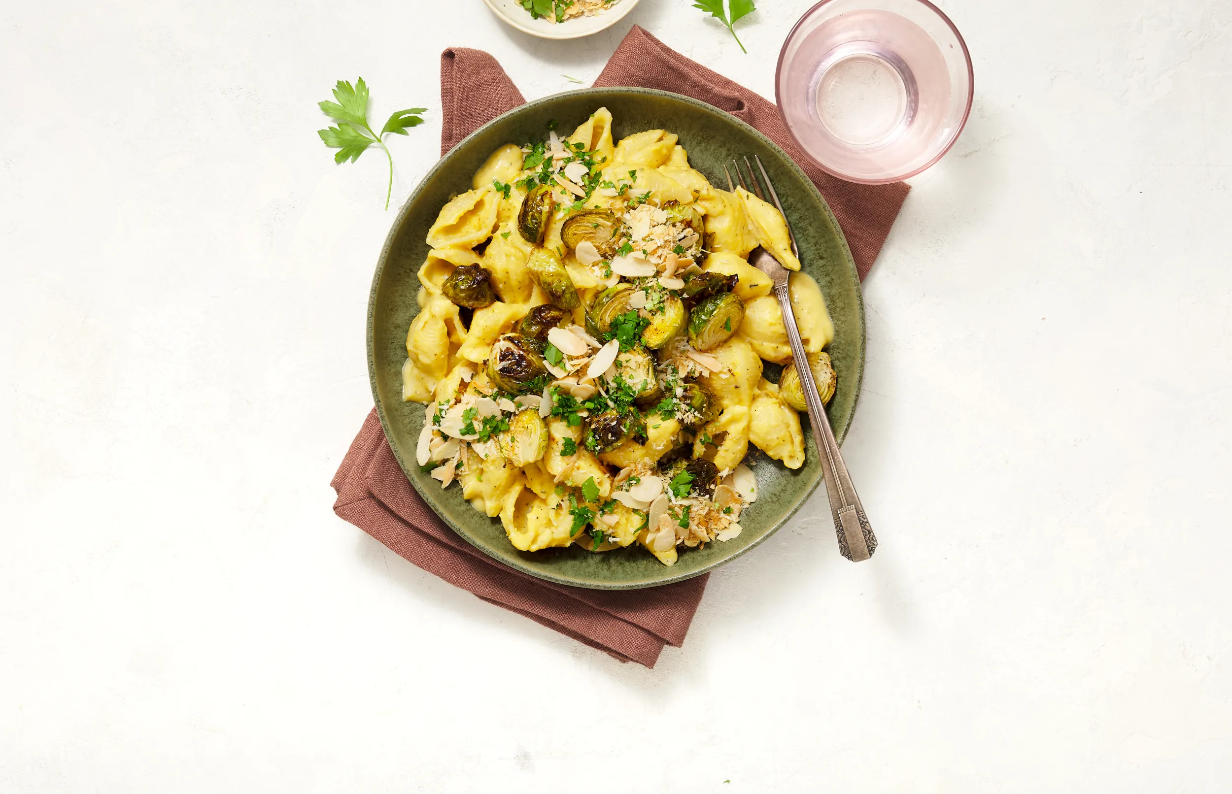 Serveer de pasta met de spruitjes. Rasp naar smaak de kaas (met fijne rasp) erover en garneer met de amandel-panko-peterselie crunch.