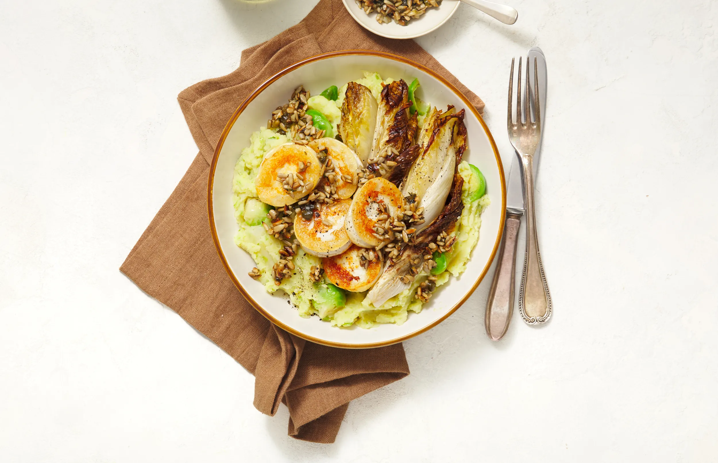 Serveer de stamppot met de witlofparten en gebakken geitenkaas. Besprenkel royaal met de rozemarijn-zonnebloemcrunch.