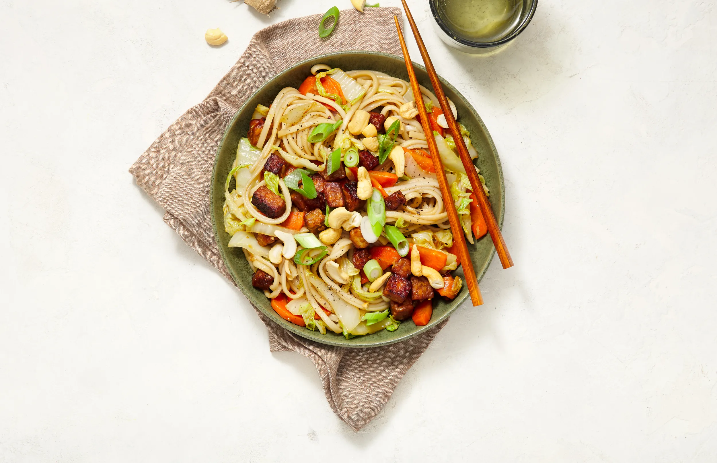 Meng de noedels door de groenten. Breng op smaak met peper en zout en bestrooi met de tempeh, 40 g cashewnotenstukjes en lente-ui. Serveer met een partje limoen.