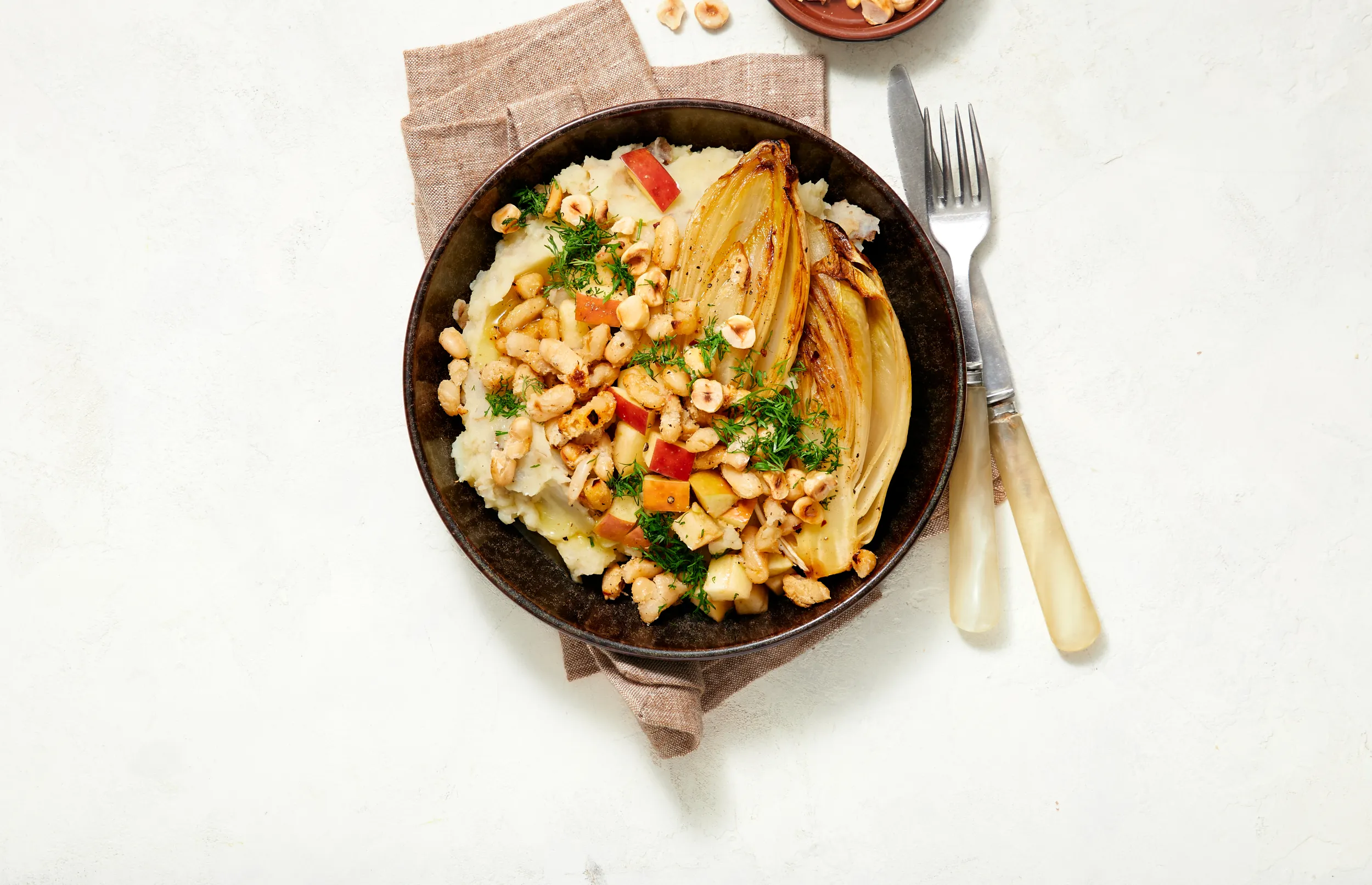 Aardpeer-aardappelpuree met gebakken witlof, appel, krokante boontjes, hazelnoten en dille