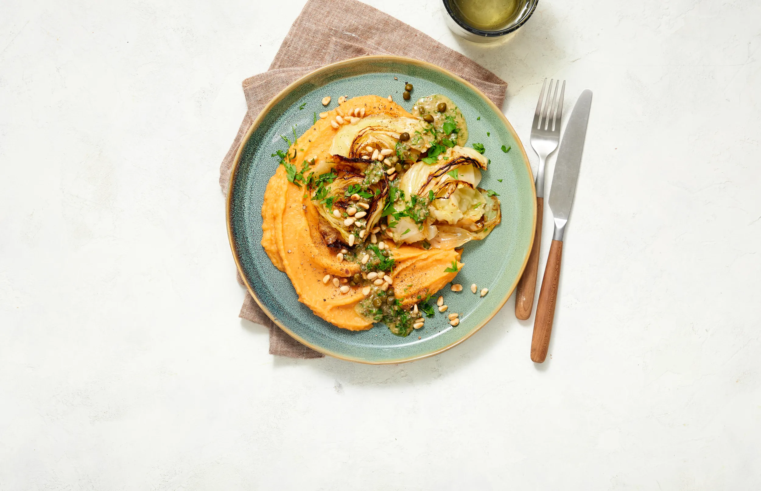 Serveer de spiskool op de zoete aardappelmousseline en schenk de misosaus er royaal overheen. Garneer met de pijnboompitten en de resterende peterselie.