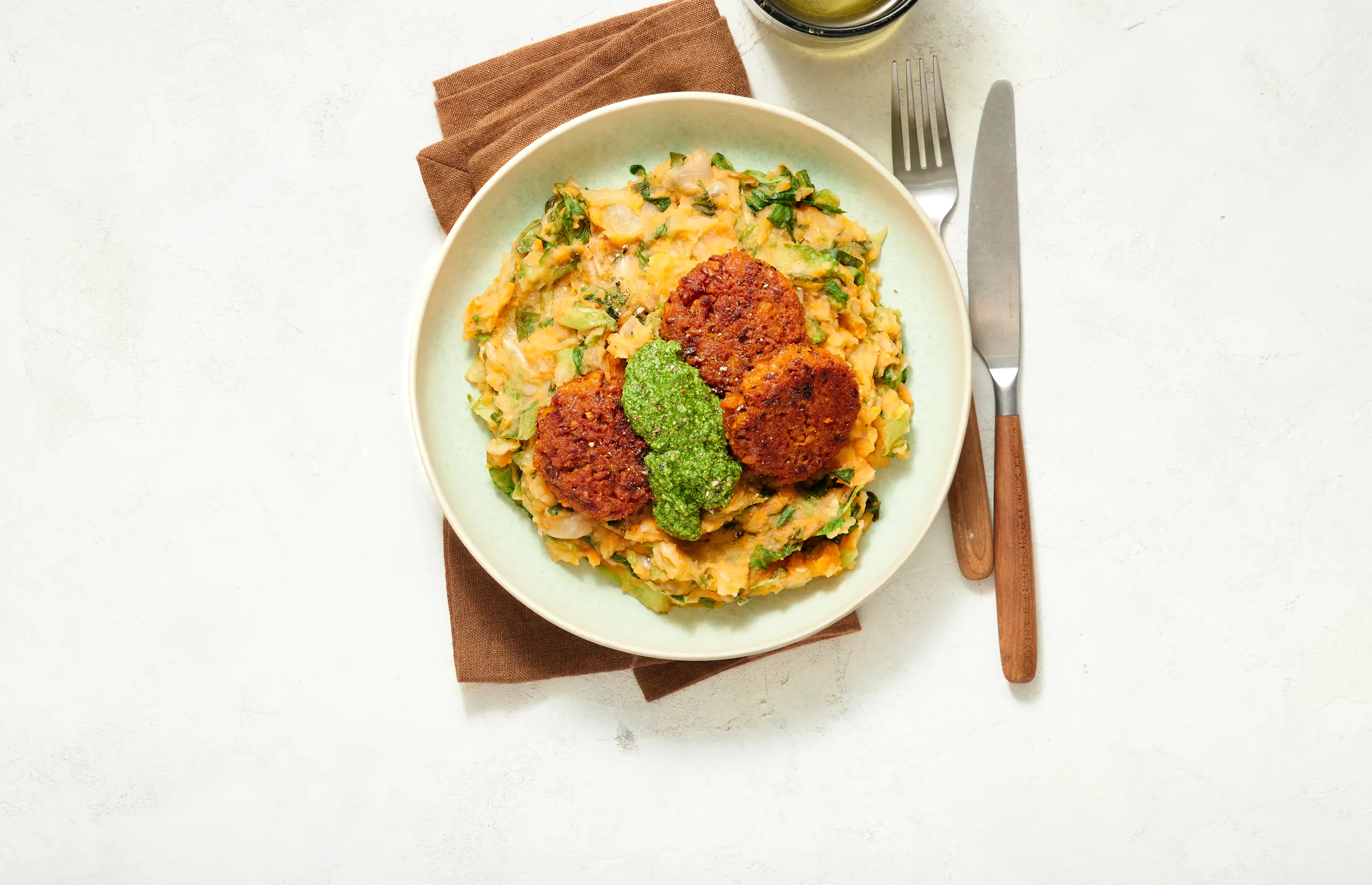 Serveer de andijviestamppot met de burgertjes en de pistou.