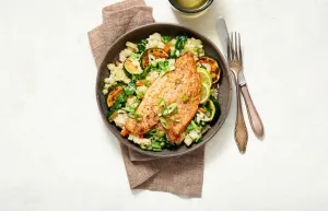 Schep de groenten door de risotto. Breng op smaak met een goede scheut olijfolie extra vierge en flink peper uit de molen. Serveer met de dorade en bestrooi met de limoenrasp. Laat ieder op smaak brengen met een partje limoen.