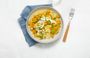 Serveer de koolraapcurry met de bulgur, pinda’s en muntyoghurt.
