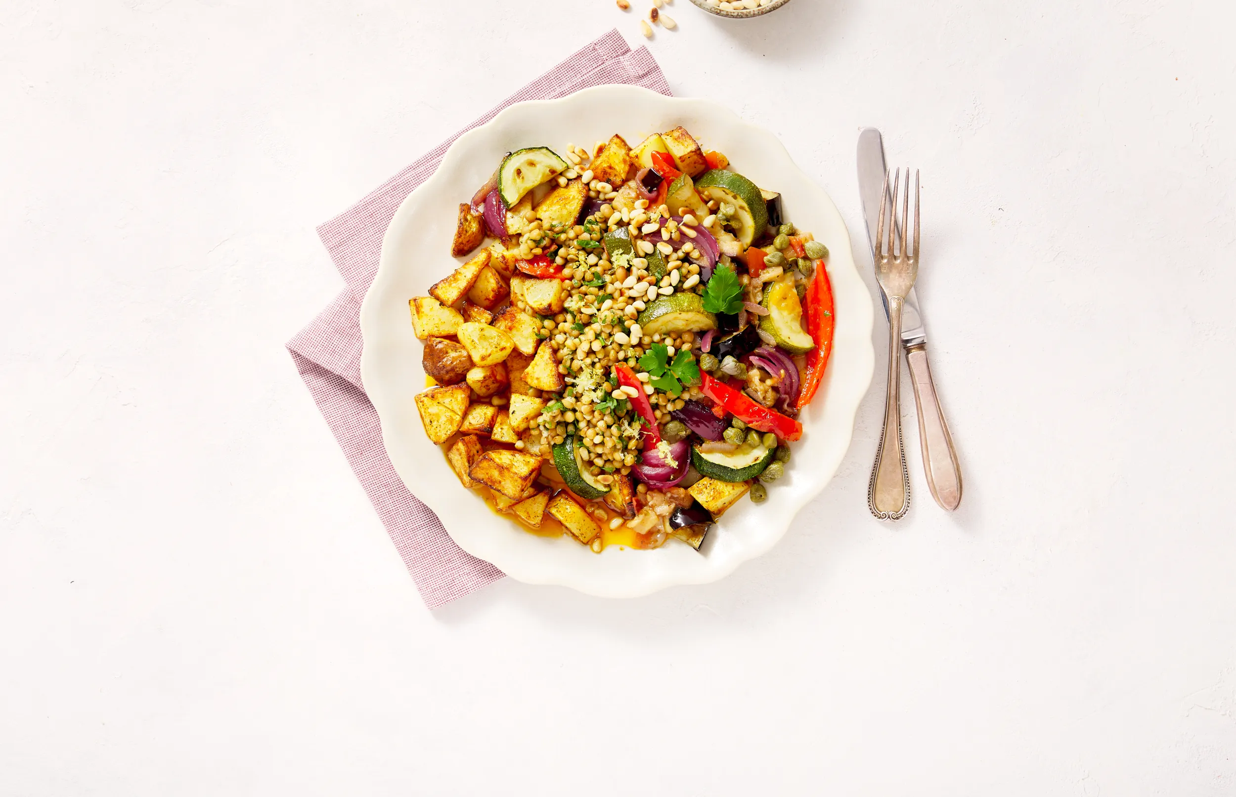 Garneer de ratatouille met de pijnboompitjes. Serveer met de gebakken aardappeltjes en de linzensalade.