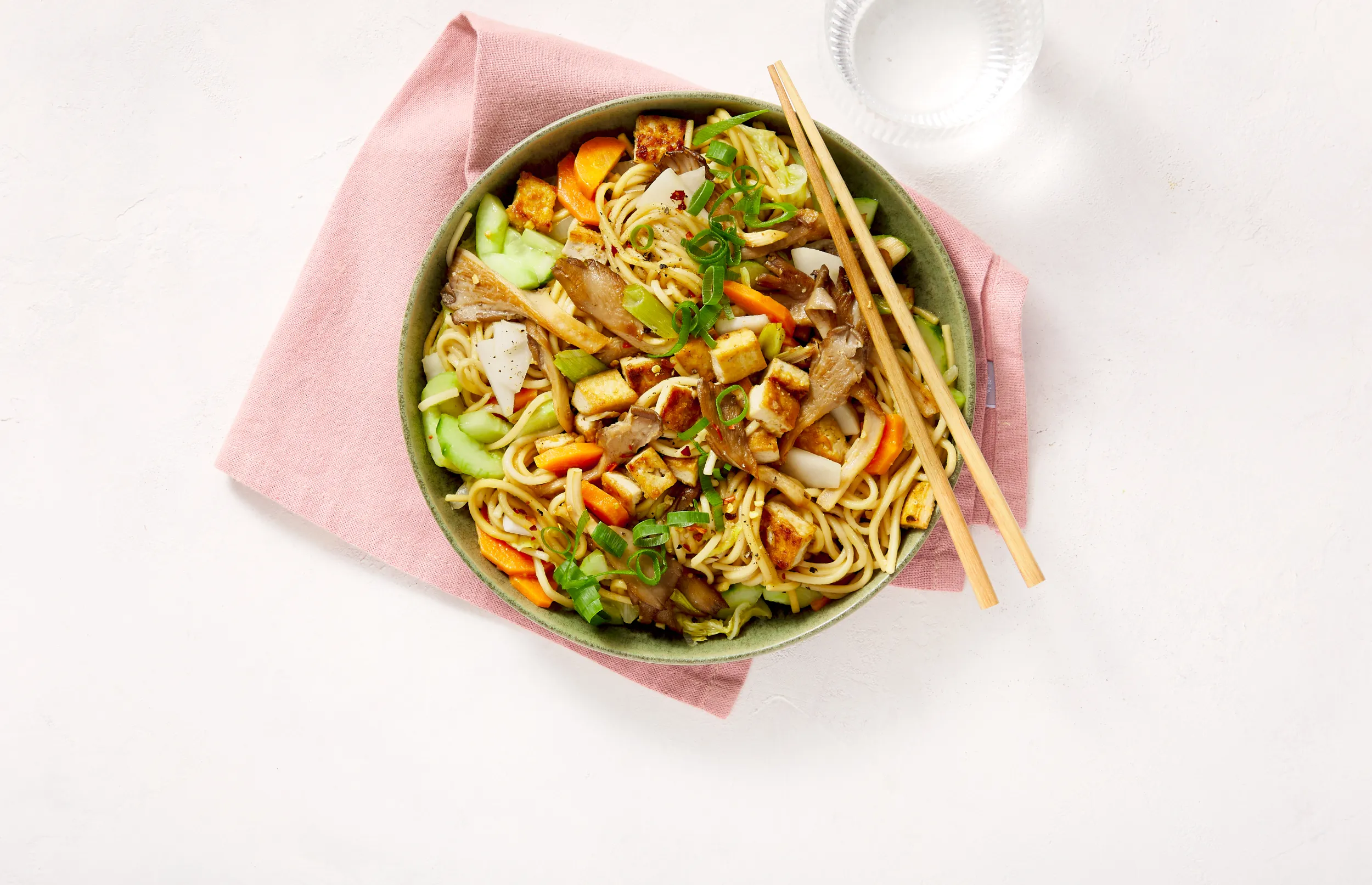 Voeg de marinade bij de tofu en oesterzwammen, zet het vuur uit en schep stevig om zodat alles goed bedekt is. Serveer bij de noedels en garneer met de lente-ui ringetjes.