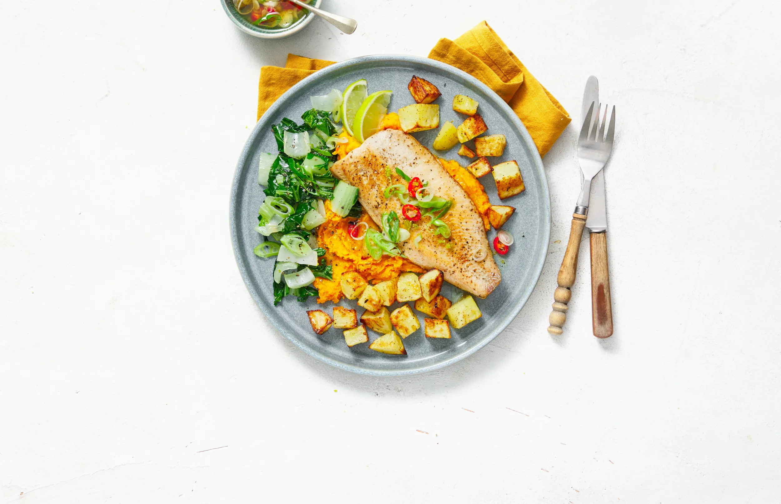 Verdeel de de groentenpuree over de borden en serveer direct met de vis, de Oosterse dressing, de gebakken aardappels en evt. wat mayonaise.