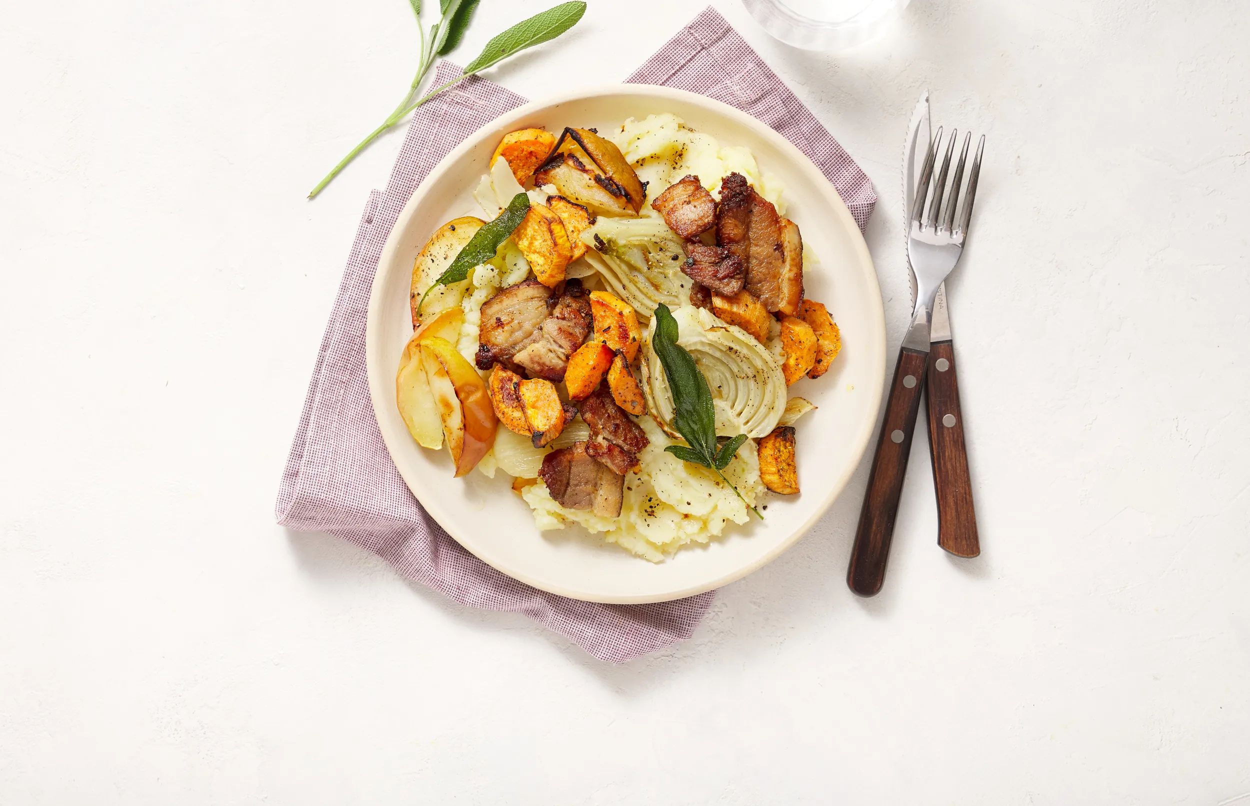 Verwijder loof en onderkant van 1 stuk venkel en snij in stevige plakken. Voeg bij de zoete aardappel samen met 3 teentjes knoflook in de schil en 175 g buikspek.