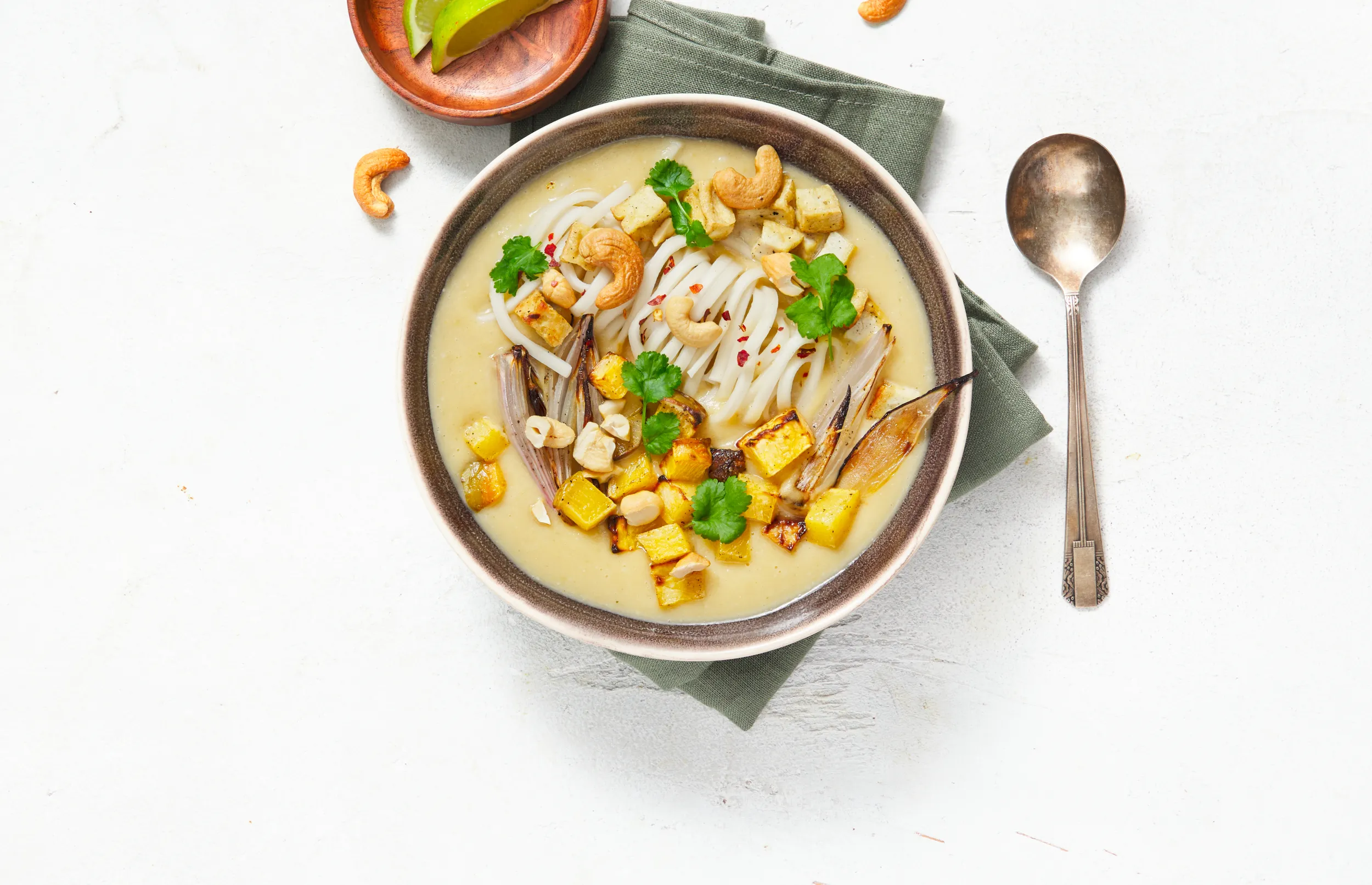 Verdeel de noedels over grote soepkommen, schep de soep erin en verdeel de sjalotparten, tofu, achtergehouden koolraapblokjes en de achtergehouden koriander naar smaak erover.