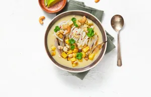 Verwarm olie in een soeppan en fruit de halve ringen zachtjes aan. Schil 1 el gember en hak grof. Hak 2 teentjes knoflook grof. Hak de steeltjes van 1 bosje koriander, hou de blaadjes apart. Voeg samen bij de sjalotringen en fruit nog één minuut. Voeg 0,1 tl chilipoeder of -vlokken en ½ el komijnpoeder toe en schep om. Voeg 200 ml kokosmelk, 250 ml water, ¾ bouillonblokje en ½ tl suiker toe en breng afgedekt aan de kook.