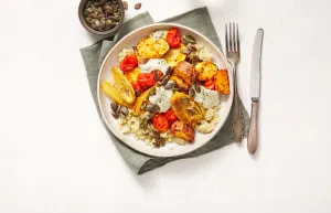 Meng ca. 1 el (bij 2p) van de fetacrème door de quinoa. Druk de gepofte knoflook uit de schil en meng door de groenten. Serveer met de quinoa, fetacrème en garneer met de rest van de pompoenpitjes.