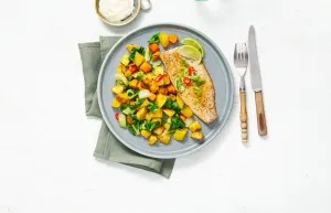 Zet het vuur onder de koekenpan hoger. Bak als de boter begint te bruinen de Beekridder zalm op de huid ca. 3 minuten. Draai nog 2 minuutjes om.