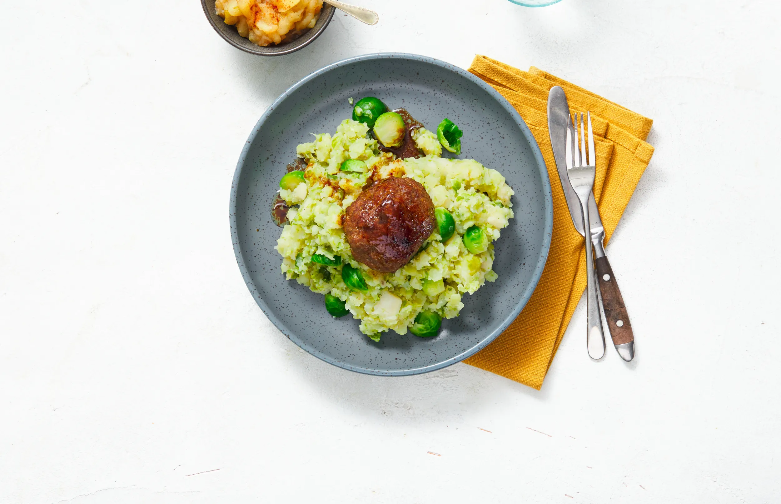 Serveer de stamppot met de gehaktballen en de appelmoes.