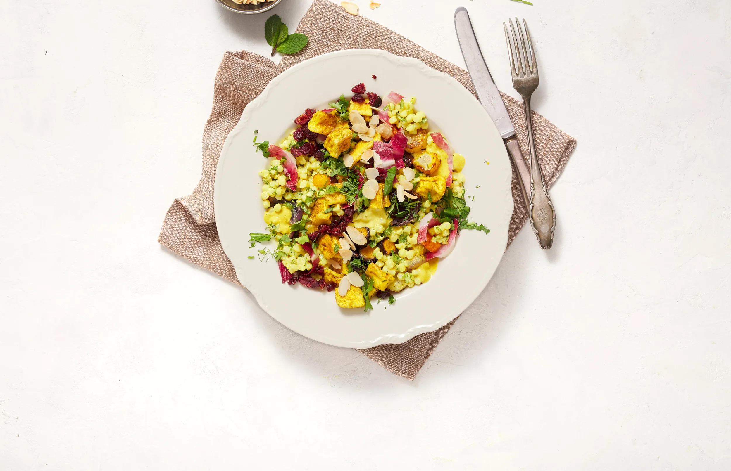 Parelcouscous met tofu, cranberry, regenboogwortel en romige kerriesaus