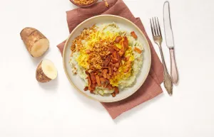Serveer de puree en de zuurkool los van elkaar of juist al gemengd, afhankelijk van je voorkeur, met de PLNT spekjes en ½ bakje gebakken uitjes.