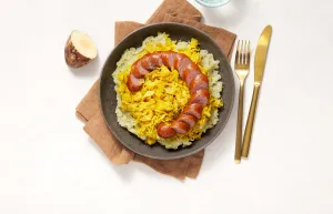Serveer de puree en zuurkool los van elkaar of juist al gemengd, afhankelijk van je voorkeur, samen met de rookworst.