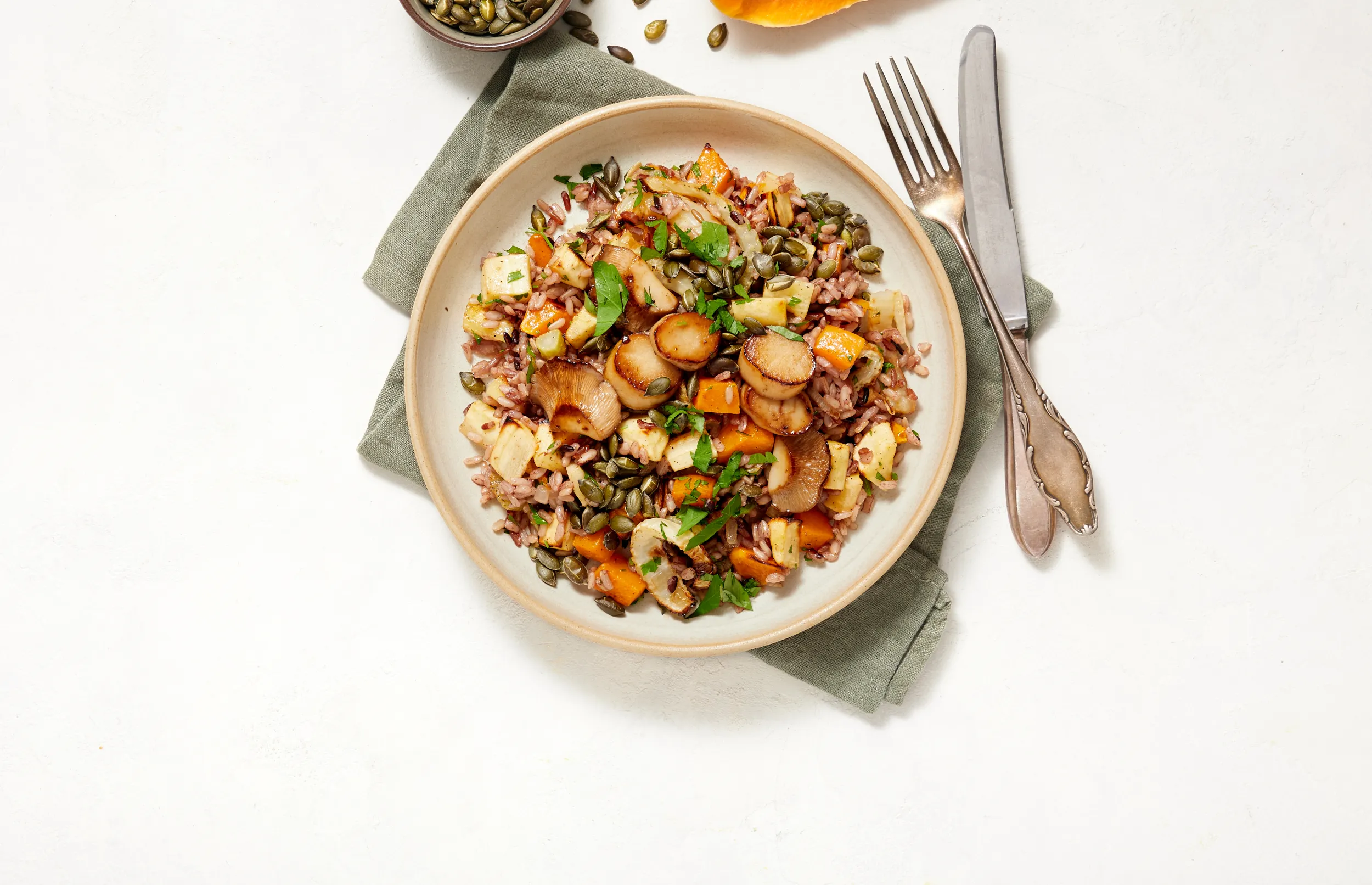 Meng in een slaschaal de gemengde rijst met de gekarameliseerde sjalot, de groenten uit de oven en een goede scheut olijfolie extra vierge. Breng op smaak met zout en peper. Serveer de boleten erbij en garneer met de pompoenpitten.