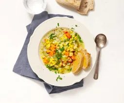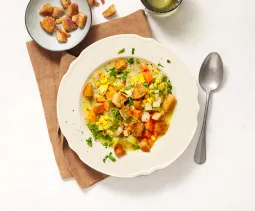 Check of de soep voldoende vloeibaar is naar je smaak, voeg anders nog wat melk of water toe en breng op smaak met zout en peper. Voeg de aardappelblokjes en 1 blikje mais (uitgelekt) toe.