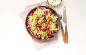 Meng couscous, het groentemengsel en de bleekselderij bij de dressing. Schep voorzichtig de wit- en roodlof erdoor.