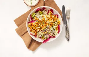Meng de boekweit, het groentemengsel en de bleekselderij bij de dressing. Schep voorzichtig de wit- en roodlof door de boekweit.