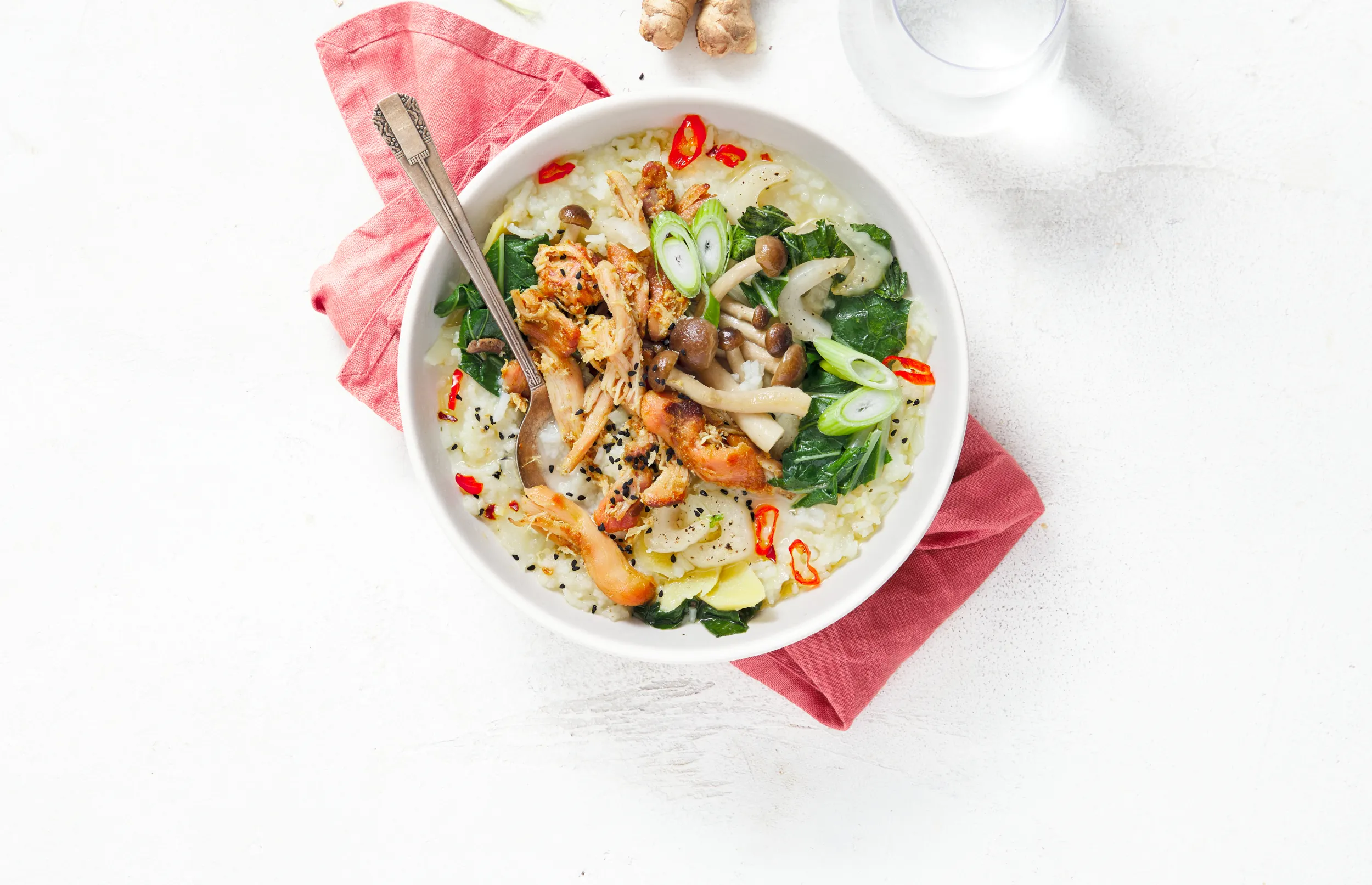 Breng 1½ blokjes kippenbouillon in een pannetje aan de kook. Schil 1 el gember, snij in dunne plakjes en dan in staafjes. Voeg met 100 g rijst bij de bouillon en laat afgedekt 25-30 minuten zachtjes koken. In feite kook je de rijst kapot, dat is ook de bedoeling, je maakt een soort dikke rijstsoep.