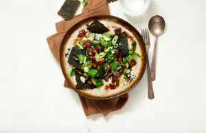 Geef ieder een grote kom rijstsoep en laat ze daarbij bundelzwammen en paksoi opscheppen. Garneer met de lente-ui en 1 tl zwart sesamzaad. Breng op smaak met de chili-knoflookolie en eventueel nog wat sojasaus naar smaak. Kruimel er zeewiesnacks naar smaak over.