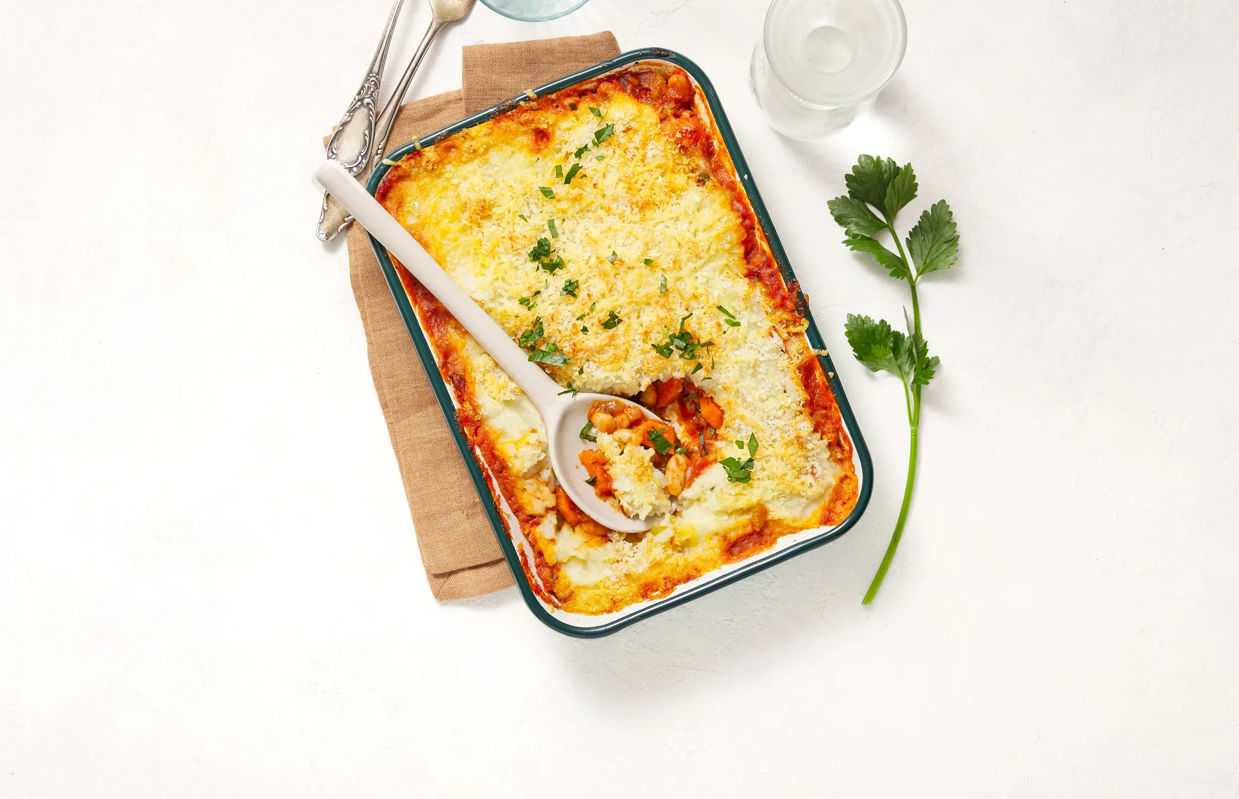 Verdeel het kaas-panko mengsel over de puree en zet ca. 10 minuten in de oven tot goudbruin en krokant.