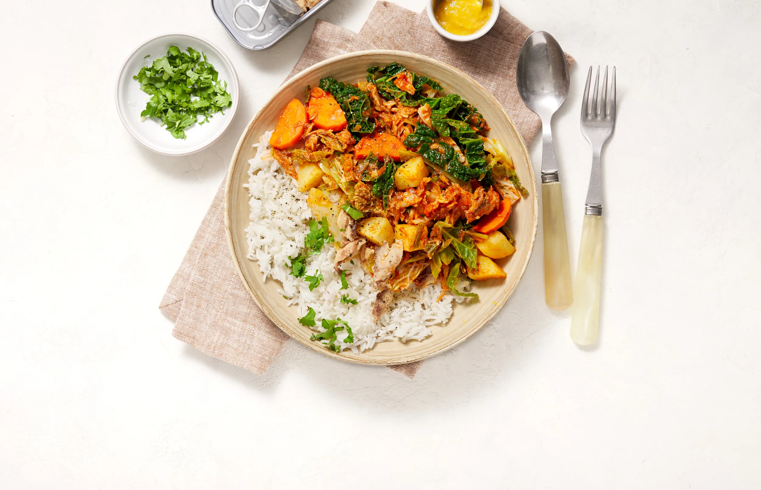 Serveer de rijst met de groenten en makreel. Garneer met de achtergehouden koriander en/of wat extra gele sambal voor de liefhebber