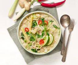 Verwijder de stukjes citroengrasstengel uit de soep voor serveren. Roer de noedels erdoor. Serveer de soep met de lente-ui en de rode peper.