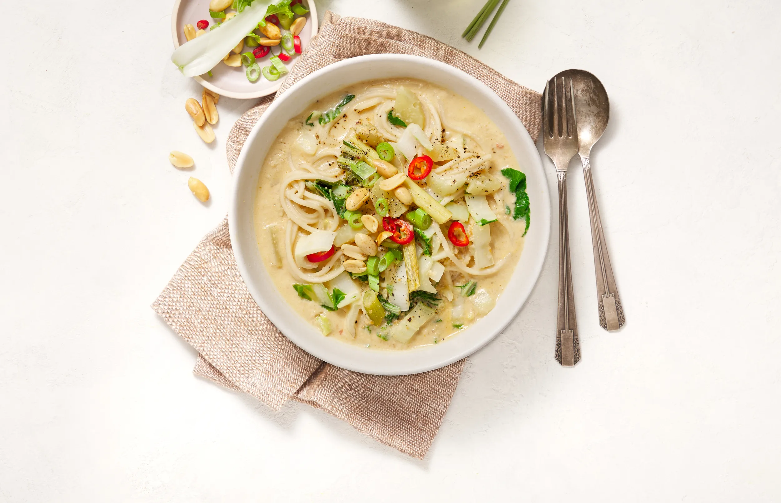 Maal 80 g pinda's met ongeveer 100 g kokosmelk in het bakje van de staafmixer tot een egaal mengsel.