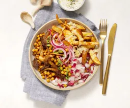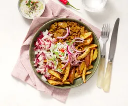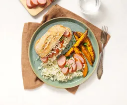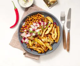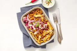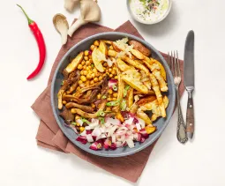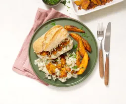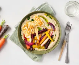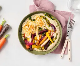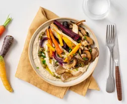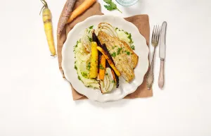 Was 350 g regenboogwortel en halveer in de lengte (dikkere exemplaren in vieren). Verwijder het loof en de onderkant van 1 stuk venkel. Snij in dunne parten. Meng in een mengkom met olie, zout en peper en besprenkel met een kneepje citroensap. Verdeel de groenten over een met bakpapier beklede bakplaat en bak ca. 20 minuten in de oven.