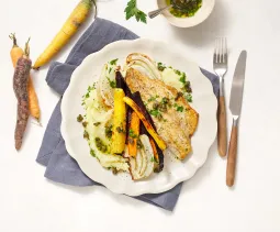 Serveer de dorade met de puree, geroosterde groenten en kruidenolie.