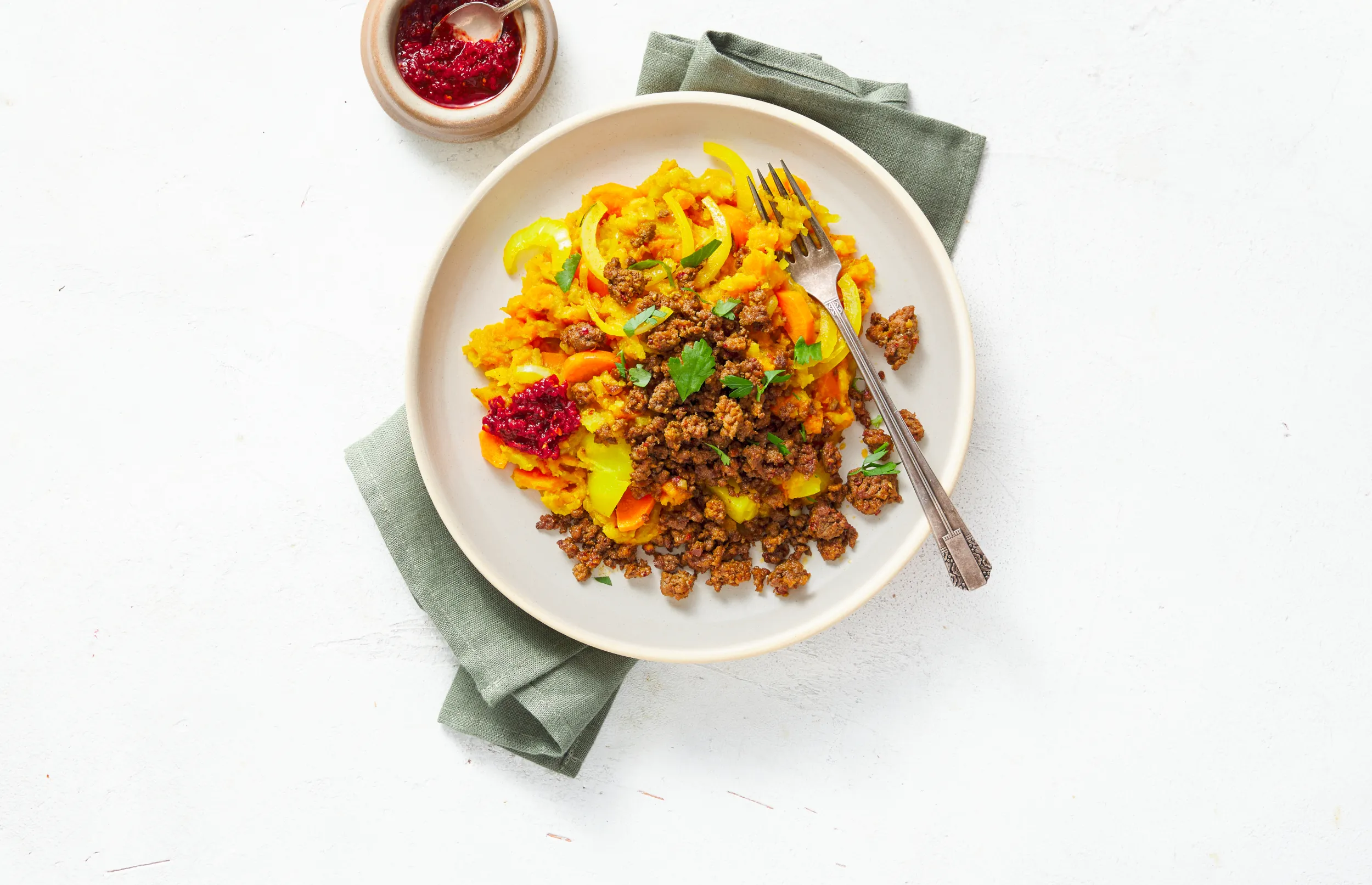 Hak 1 bosje koriander grof. Serveer de hutspot met het pittige gehakt en zet nog wat sambal op tafel voor de liefhebber. Garneer met de koriander.