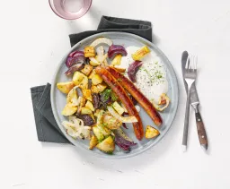 Hak 1 teentje knoflook fijn. Fruit heel even aan in dezelfde pan, voeg 1 el ketjap asin (of sojasaus) en 1 el (bij 2p) water toe en roer 1 tl sambal (manis) erdoor (mag ook andere sambal zijn). Roer de blokjes weer door de saus en houd warm.