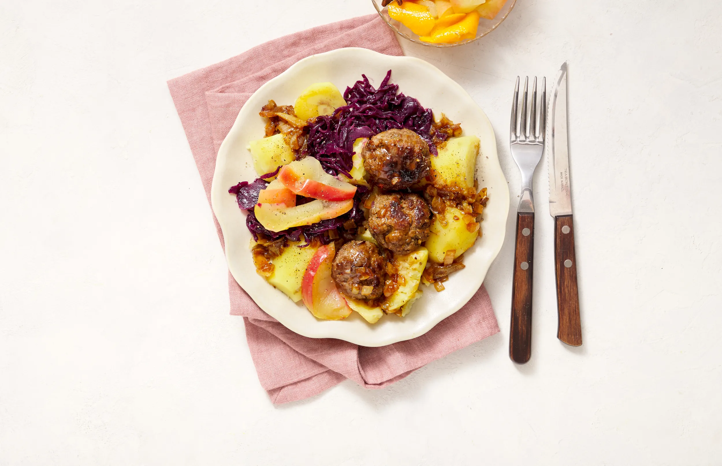 Blus de balletjes af met 1 el ketjap manis en ca. 2 eetlepels water pp. Zet het vuur uit en serveer direct met de aardappelen, rode kool en de appelcompote.