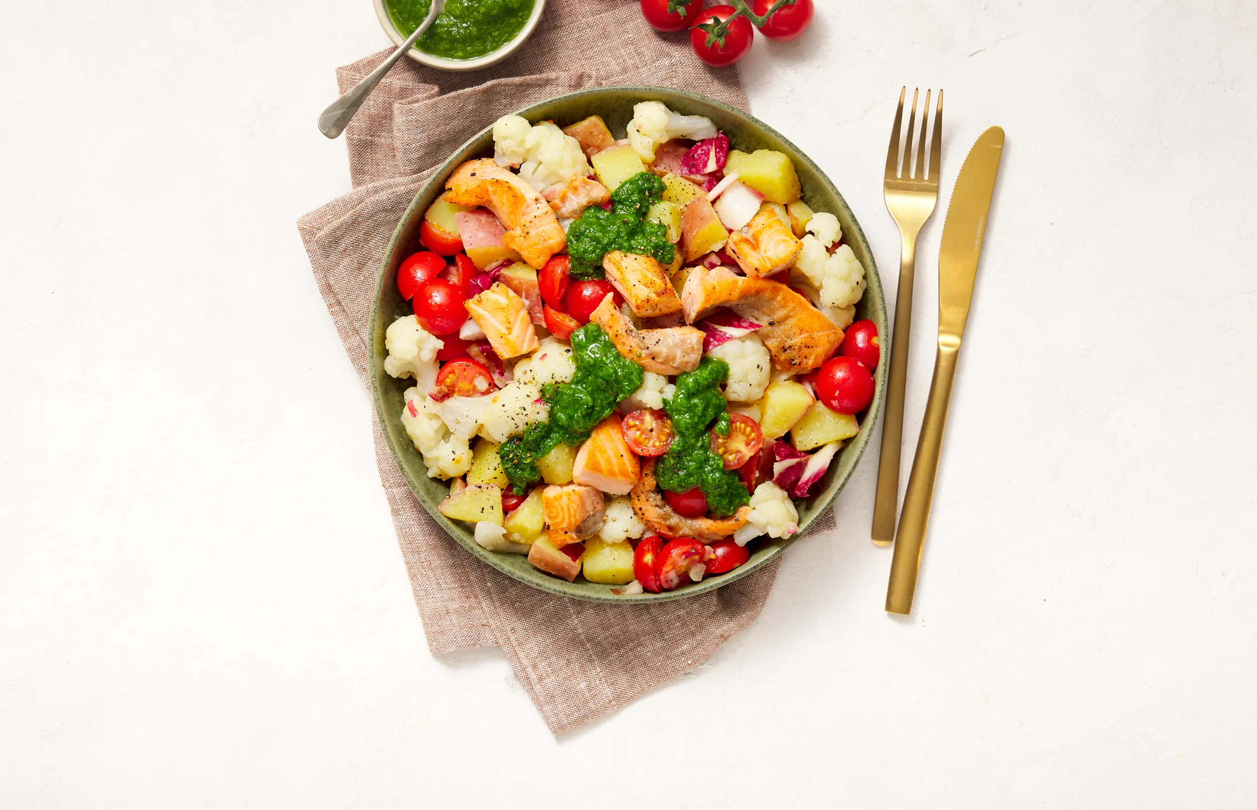 Serveer de aardappel-bloemkoolsalade met de stukjes zalm en de raapsteelsalsa.