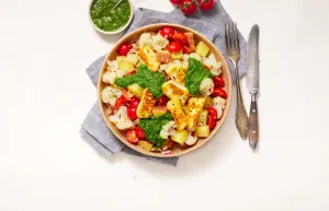 Serveer de aardappel-bloemkoolsalade met de stukjes Syrische grillkaas en de raapsteelsalsa.