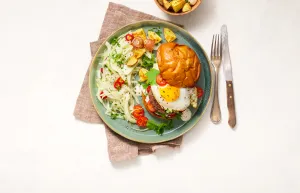 Beleg elk broodje met een paar blaadjes raapsteel, plakjes cherrytomaat, burger, mayo (of zie culi-tip) en een spiegelei. Serveer met de aardappeltjes en venkel-koolsalade.